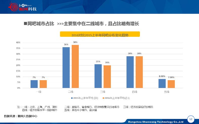 在分布城市方面,二线城市网吧最多,而且占比有增长;其次是三、四线城市。同时报告也显示,二、三线城市的用户最为活跃。