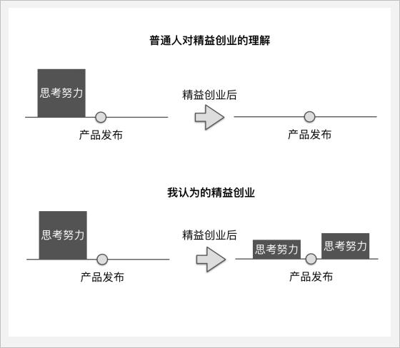 而这就是对“精益创业”这个流行理论的误解:很多人认为精益创业就等同于减少思考,殊不知,精益创业并不会减少你在思考上的努力,只不过是调整了思考的阶段——过去所有的思考分析都在产品发布前,而精益创业应用后,相当于把一部分思考分析的工作放在产品发布后。