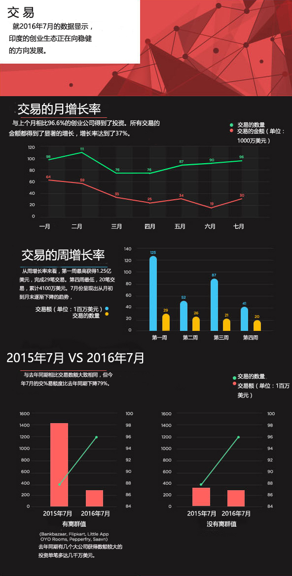 与2015年同期相比,今年7月的交易数量同比增长9%。但7月的投资额度却与去年同期相同(仅比去年同期低8个百分点,发生在FlipKart等几家公司身上的额度极高的交易不计算在内)