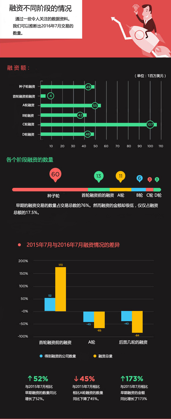 7月,针对早期的融资交易数量明显增多,占该月交易总数的76%。但交易金额不高,仅占融资总额的17.5%。与去年同期相比,7月份针对早期项目的融资交易数量上涨了52%,融资金额更是同比增长了173%。这说明投资方开始注重寻找好的项目,而不是像2015年那样只投资大的项目。