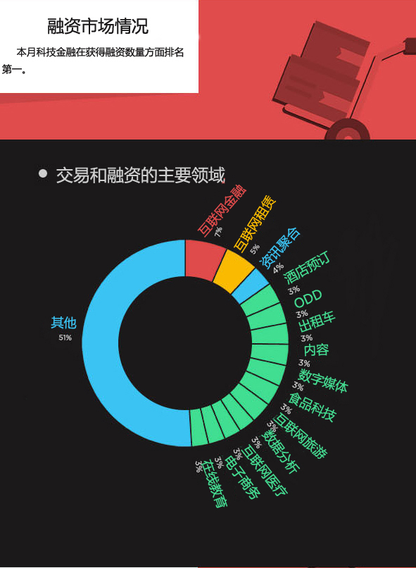 互联网金融成为7月投资最热门行业,占比为7%,其次是互联网租赁(5%),聚合类咨询网站排名第三(4%)。其他如酒店、出租车、食品科技、旅游等产业占比均为3%。