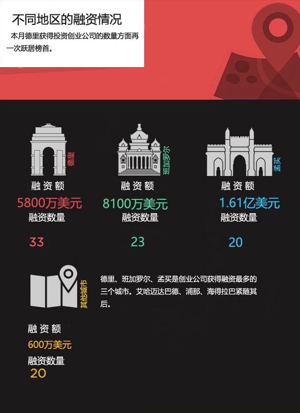 7月,德里地区超过创新中心班加罗尔成为完成融资交易最多的地区(德里33笔交易,班加罗尔23笔)。孟买则成为吸引资金最多的城市,融资额度最高的是孟买(1.61亿美元)。