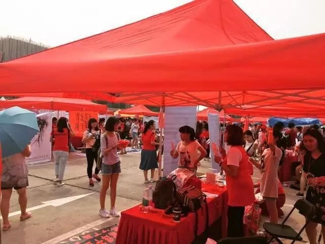 8月6日当天,场馆外红色帐篷一字排开,硬生生摆出了好几列。上午9点多,这里已经挤满了人,她们多是身穿红色衣服,背后印着大大的1128(11月28日是易烊千玺的生日),三两成群在各个摊位来回穿梭,看到中意的应援物或者事先预定了灯牌便排队去领,这让身处其中的我颇有种逛庙会的感觉。用粉丝专用术语来说这就是场外应援。而场外应援千家完胜。