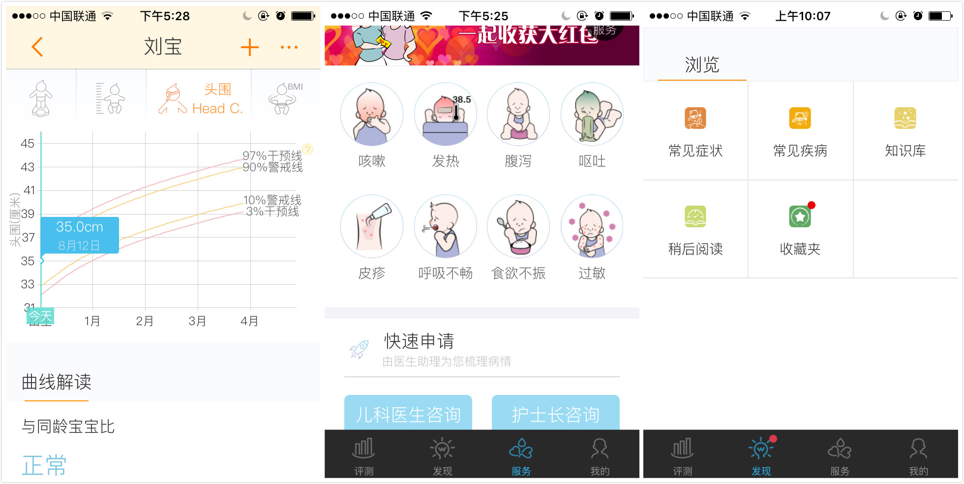 小鲤鱼育儿的健康管理从记录宝宝的健康数据开始,其思路是将医院医生的健康评测由院内延展到院外,由单点记录变成连续记录并生成成长曲线。用户通过小鲤鱼育儿记录下宝宝的身高、体重、头围、以及测量日期前后母乳奶粉喂养比例后,平台根据算法对这些健康数据进行发育水平、生长速度、匀称性等关键指标进行横向评测,指出该宝宝在同龄宝宝中的大致水平和生长趋势的同时,也有连续记录的各个指标的曲线图表和对应的解读。用户持续记录后,也能做个体化纵向评测,让用户及时掌握发育不足、迟缓、过速等发育趋势。小鲤鱼育儿还上线了运动发育评测,有利于确定宝宝运动能力是否正常。类似的,小鲤鱼育儿将来还会有语言发育评测。
