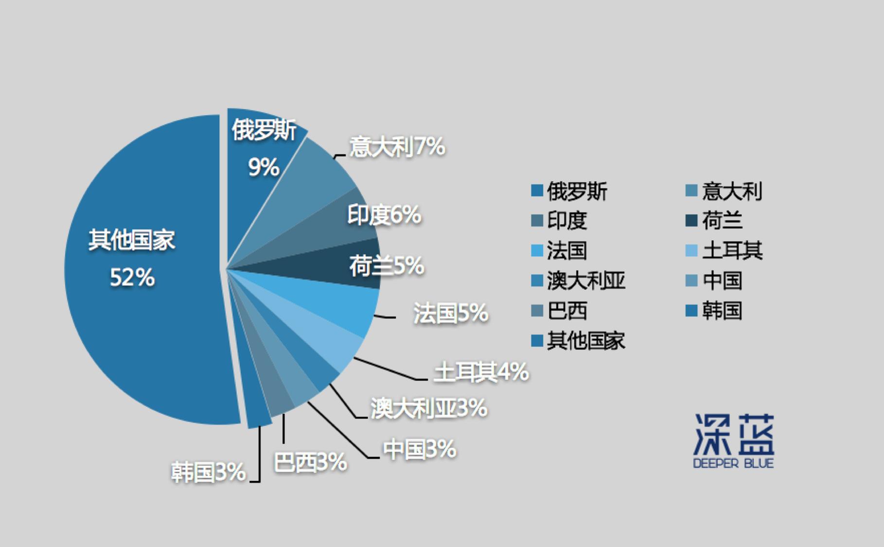 前十名的国家中,俄罗斯高居榜首,其次是意大利、印度、比利时、法国、土耳其、澳大利亚、中国、巴西、韩国。其中,印度从 2015 年的第四名上升到 2016 年的第二名。