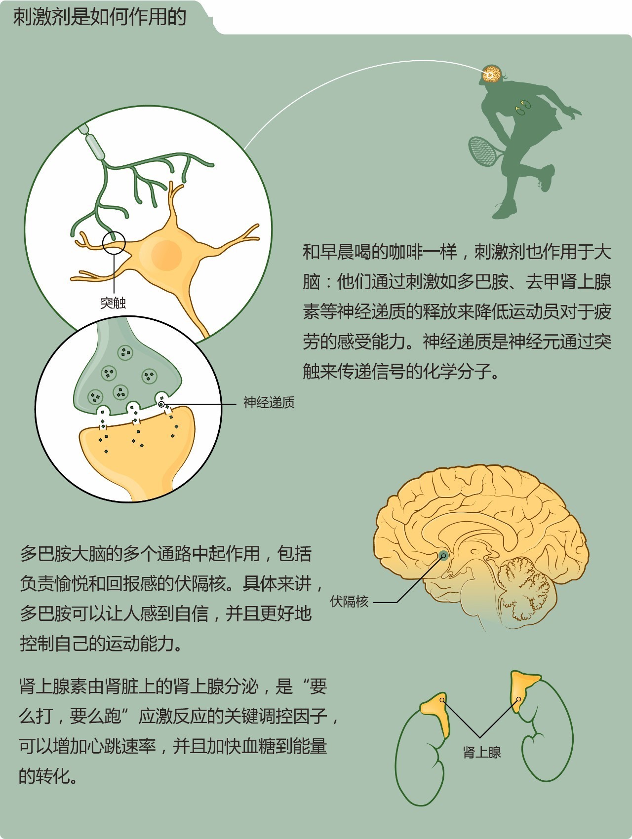 使用了刺激剂的运动员会感到有更多的能量,并且一直保持着高度紧张的状态。刺激剂让人的反应变得更快。于是刺激剂变成了棒球运动员、自行车手以及跑步运动员的最爱。但同时刺激剂也有副作用,它会干扰人体正常的温度调节系统,比如杀死高温天气下露天比赛的自行车运动员。