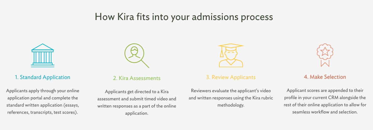 Kira Talent 是一个在线申请系统,目的是帮助院校招生官对申请学生做初步判断。判断的方式主要有两种:首先,招生官们需要提前录制好一些问题,申请者们会通过视频进行作答,每个人只有一次回答机会;除此以外,招生官们还会拿到一份学生的笔试答案,这考验的是学生的实时写作能力,拿到答案后招生官会通过对比答案分出优劣。