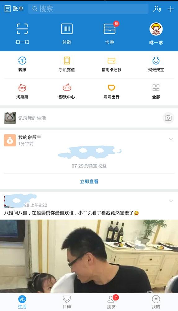 新版不同。我常通过淘宝APP里的“淘票票”购买电影票,不过比较难找,要翻一屏。现在打开支付宝,淘票票就在第一排。可以猜测,支付宝与淘宝有数据共享,所以才了解我在淘宝的使用习惯。外地的朋友给我发了一个顺丰快递,运单状况居然也被支付宝推送给了我,显然顺丰的数据也和支付宝打通了,自动根据姓名、手机等匹配。再往下有支付宝朋友圈的照片,以瀑布流的形式展现。但问题就在这里。