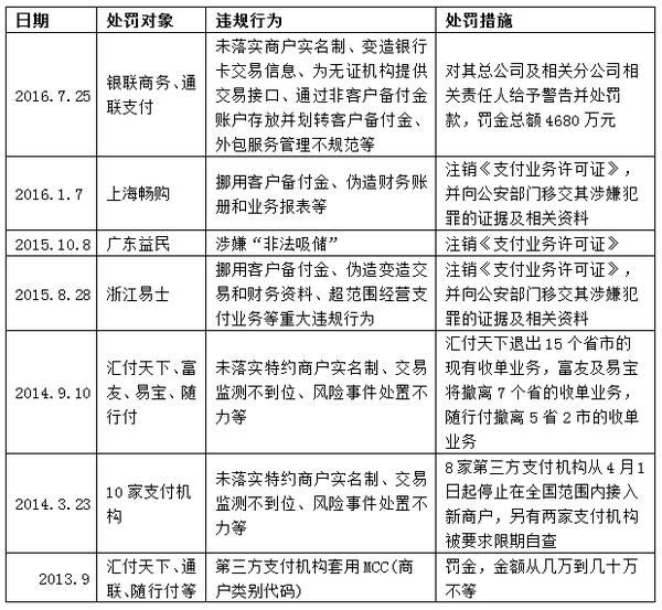 力度空前的互联网金融专项整治进行了数月,频频逾越红线的第三方支付成为整治暴风眼,让央行连下狠手,2015年8月至2016年1月,央行先后吊销了三家机构的牌照,包括大量违规挪用客户备付金、伪造编造支付业务的浙江易士、涉及非法集资的广东益民和挪用备付金的上海畅购,2016年5月,更是推迟了第一批27家持牌机构的牌照续展工作。