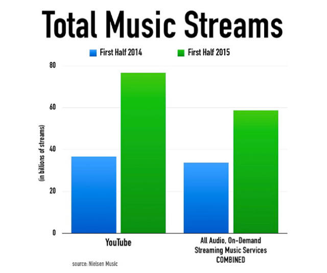 与2014年上半年相比,2015年YouTube的流音乐总额得到了大幅度的提升,提升额度将近2倍。