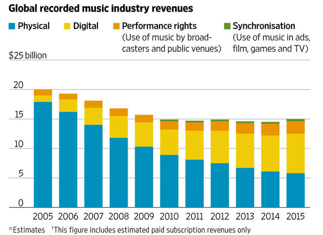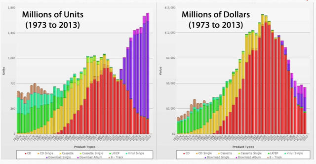 根据上图,40年间,音乐产业的附着介质已经基本从黑胶唱片过渡到了流媒体。与以往相比,现在流媒体服务在音乐产业的营收中占了很大比例。据美国唱片业协会的统计显示,YouTube去年的视频播放营收增长率超过100%,而美国艺术家的该项收入却只增长了17%。