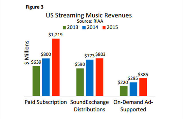 根据RIAA的数据,近三年,流音乐的付费订阅用户所创造的营收呈现大幅度增长,2013年,该项收入只有6.39亿,而到了2015年则达到了12.19亿,涨幅高达94%,此外,音频聆听创收和广告营收也呈现出上升趋势。