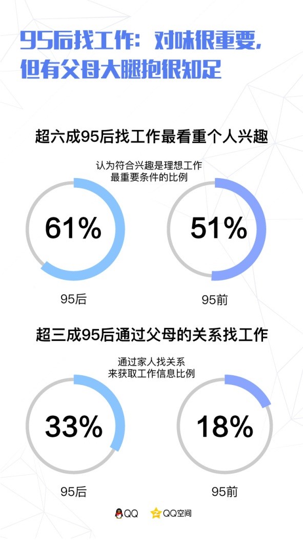 从报告中可以看出,虽然95后在找工作上更依赖父母的资源,但95后更爱玩,思想更开放,也更看重自我价值的实现,展现了与95前截然不同的风采。