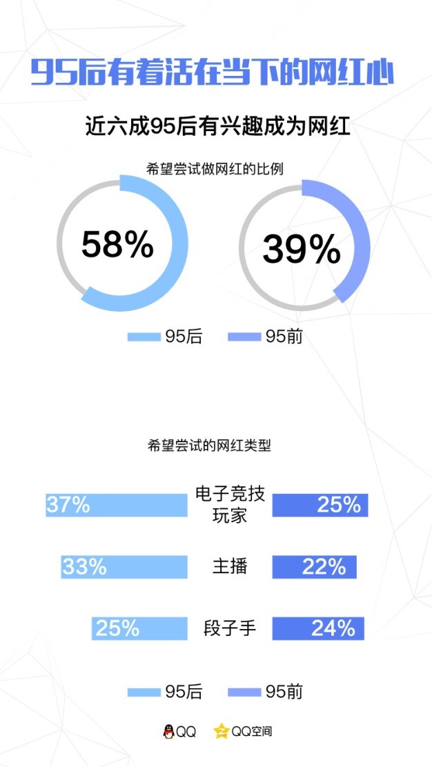 值得注意的是,近六成的95后有兴趣成为网红,最想成为的网红类型是电子竞技玩家和主播。这体现了他们更乐意在网络上展现自我,也更爱玩的一面。