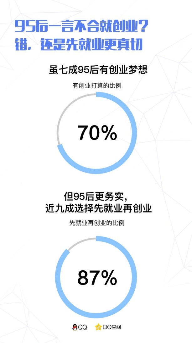 但与此同时,高达7成的95后有创业的想法,这体现了他们思想开放、注重实现个人价值的一面。他们比大家预期的要务实地多,绝大部分选择先就业再创业,累积经验和人脉再去尝试。而天生爱玩的95后近四成是为了个人兴趣选择创业,更有“玩着玩着就火了”的平常心。