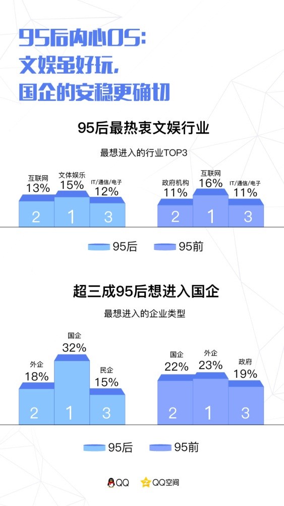 生活在物质更充裕的时代,95后较少拼搏奋斗的精神。数据显示,超三成95后通过父母的关系找工作,是95前的近两倍。而且,95后更加贪图国企的安逸和稳定,高达32%的人最想进入国企,远超出外企和民企。