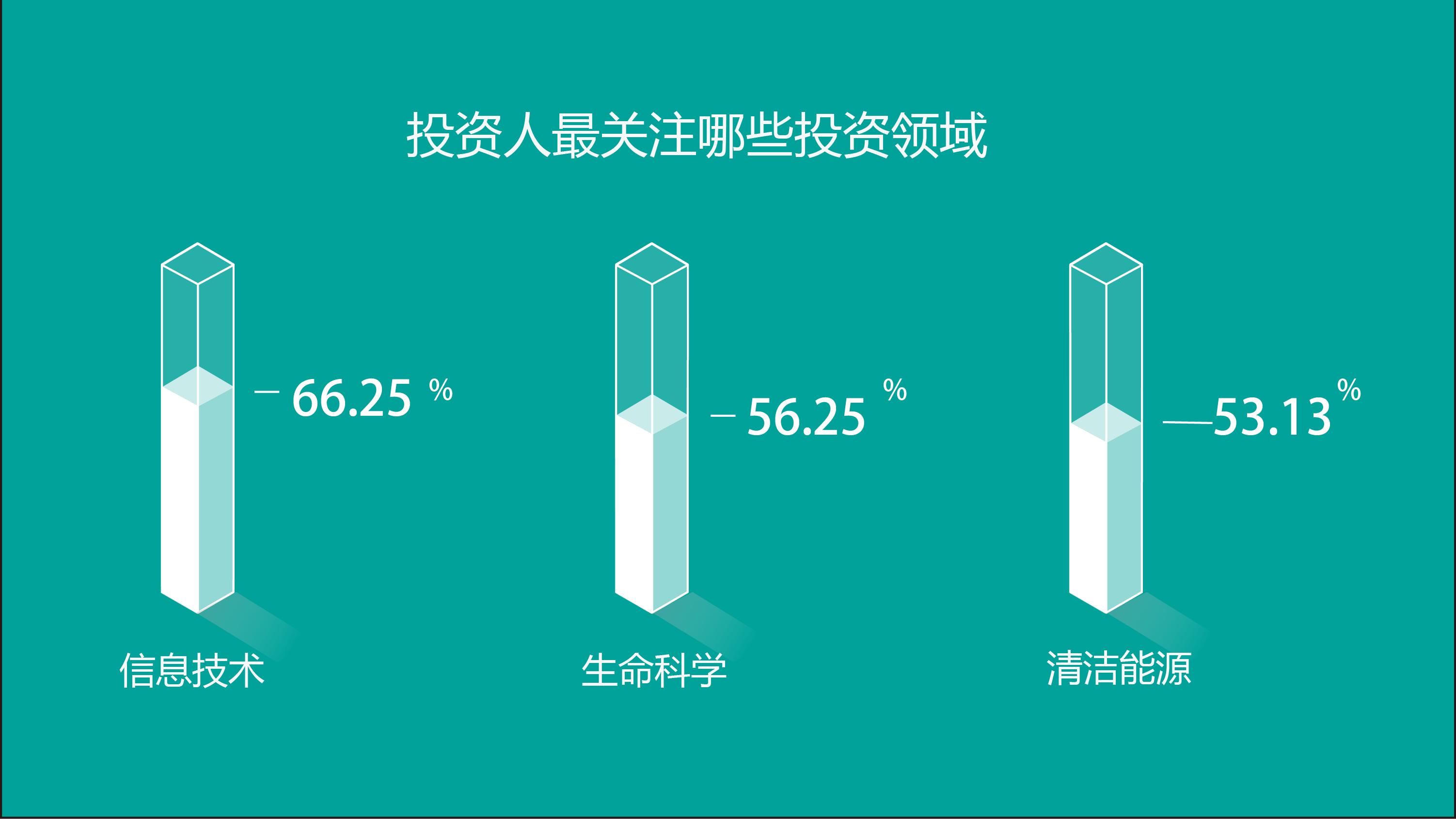 在调查中,投资者被要求选择他们最愿意投资的三种类型的公司,结果如下:信息技术和通讯最吸引早期深科技投资者(66.25%)最吸引投资者,其次是生命科学(56.25%),能源和绿色科技(53.13%)排名前三。
