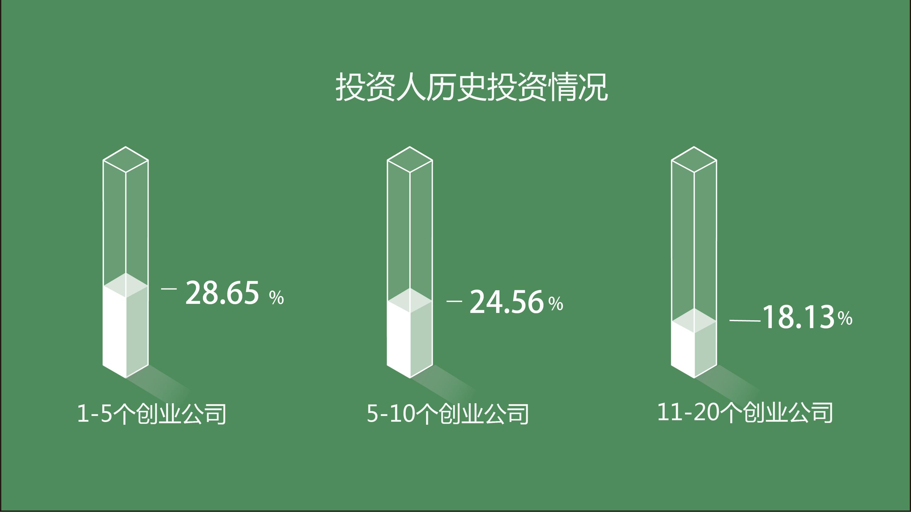 投资人们已在投资圈爬摸滚打多时。近乎 1/3(28.65%)的调查者曾投资过 1 到 5 家初创公司,约 1/4(24.56%)的这些投资家曾注资过 5 到10 家初创企业,18.13% 的天使投资人投资了 10-19 家公司。36.25% 的调查者期望的年回报率在 10%-20%,30.63% 的调查者期望年回报率在 10%-30%。