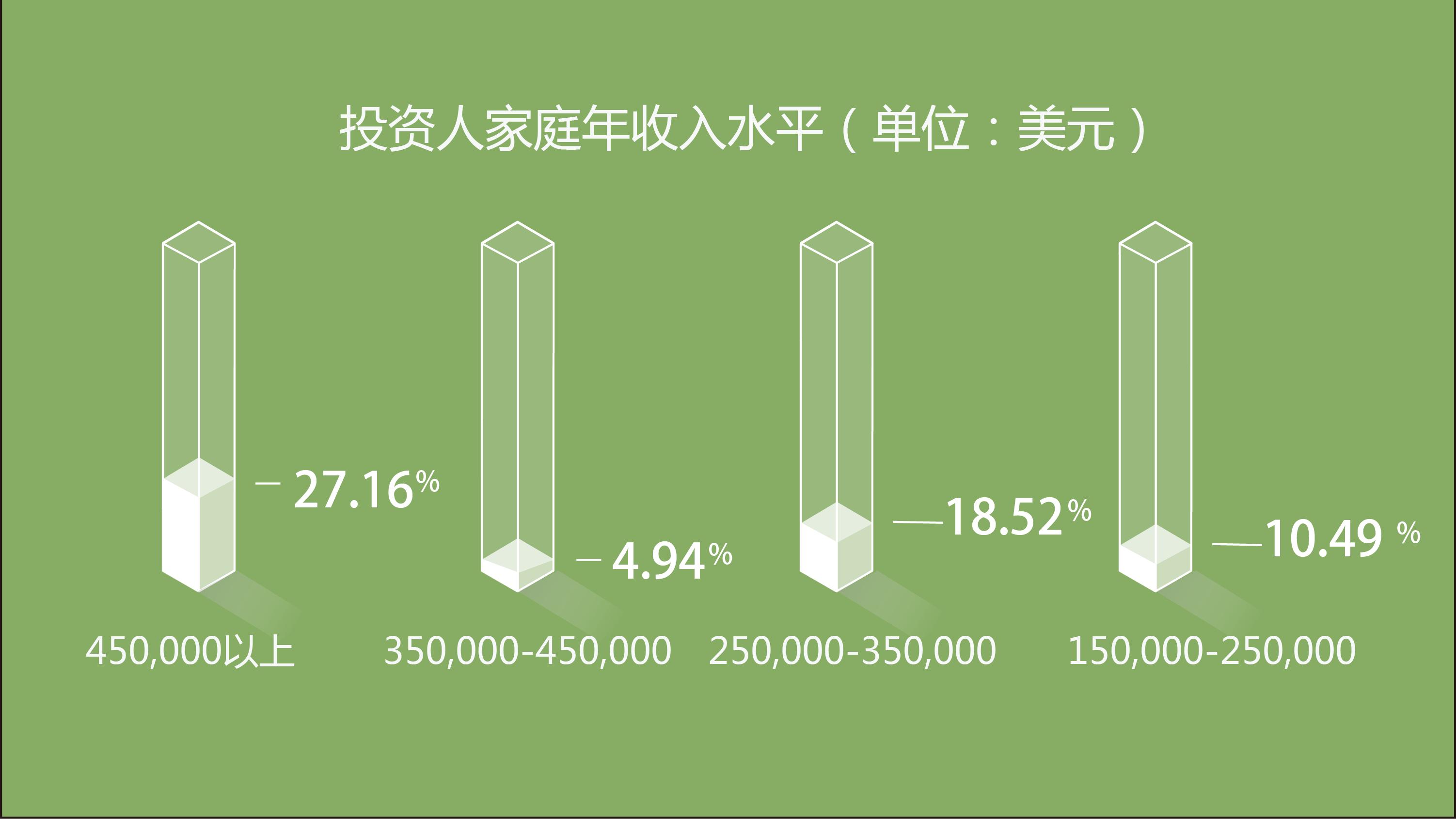 绝大部分投资人家境殷实。根据公开的调查者个人信息数据来看,27.16% 的调查者家庭收入达 450,000 美元或以上,18.52% 在 250,000 美元到 350,000 美元,10.49% 在 150,000美元到 250,000 美元,4.94% 在 350,000 美元到 450,000 美元。 而据美国联邦调查局 2014 年公布,美国家庭收入中位数为 53,657 美元。