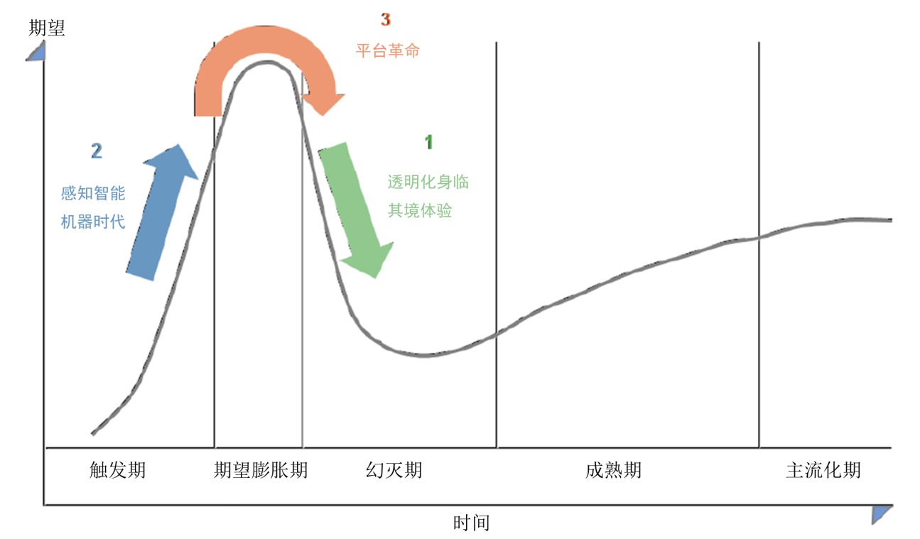 增强现实(AR)是使用实时的文本、图形、声音和其他材料与真实世界的对象相关联,用头戴式的设备演示或投影成图像的技术。虚拟世界中,不同的扩增实境都可以转化为真实世界。这种技术的目的就在于增强用户与环境的联系。目前的技术是为了解决特殊的、专业的案例。因此,曲线上的位置与到达成熟所需的时间,会因企业发展的不同而不同。这代表了人们对市场上增强现实的普遍观点。