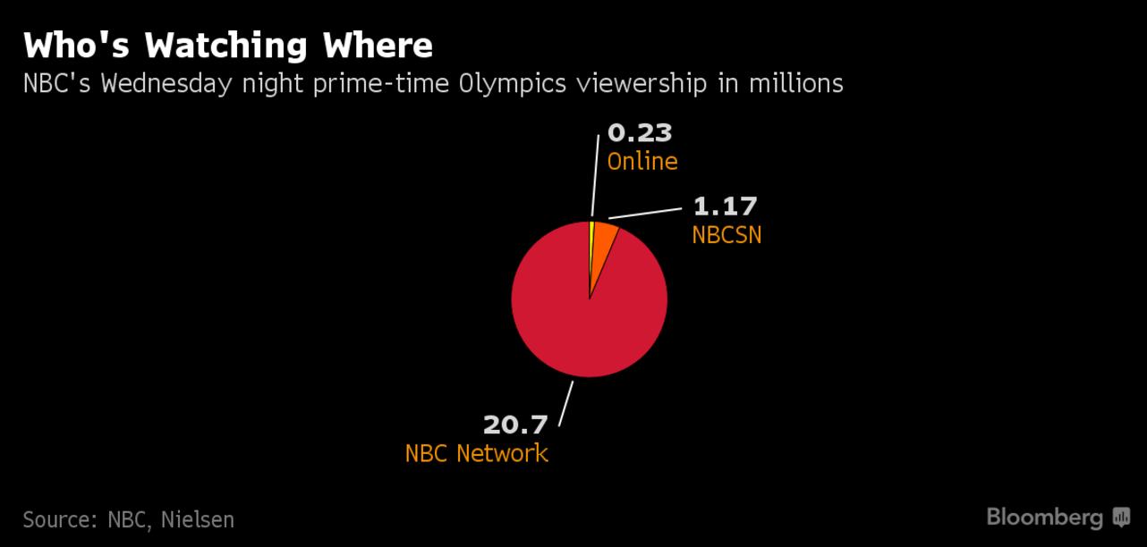 数据显示,NBC直播奥运会的黄金时段收视率相比伦敦奥运下跌了17%,尤其是18-49岁的人群,根据彭博社的报告收视率极速下滑了25%,与之相对的NBC奥运网站和APP用户流量却达到7800万,相比伦敦奥运期间上升了24%。