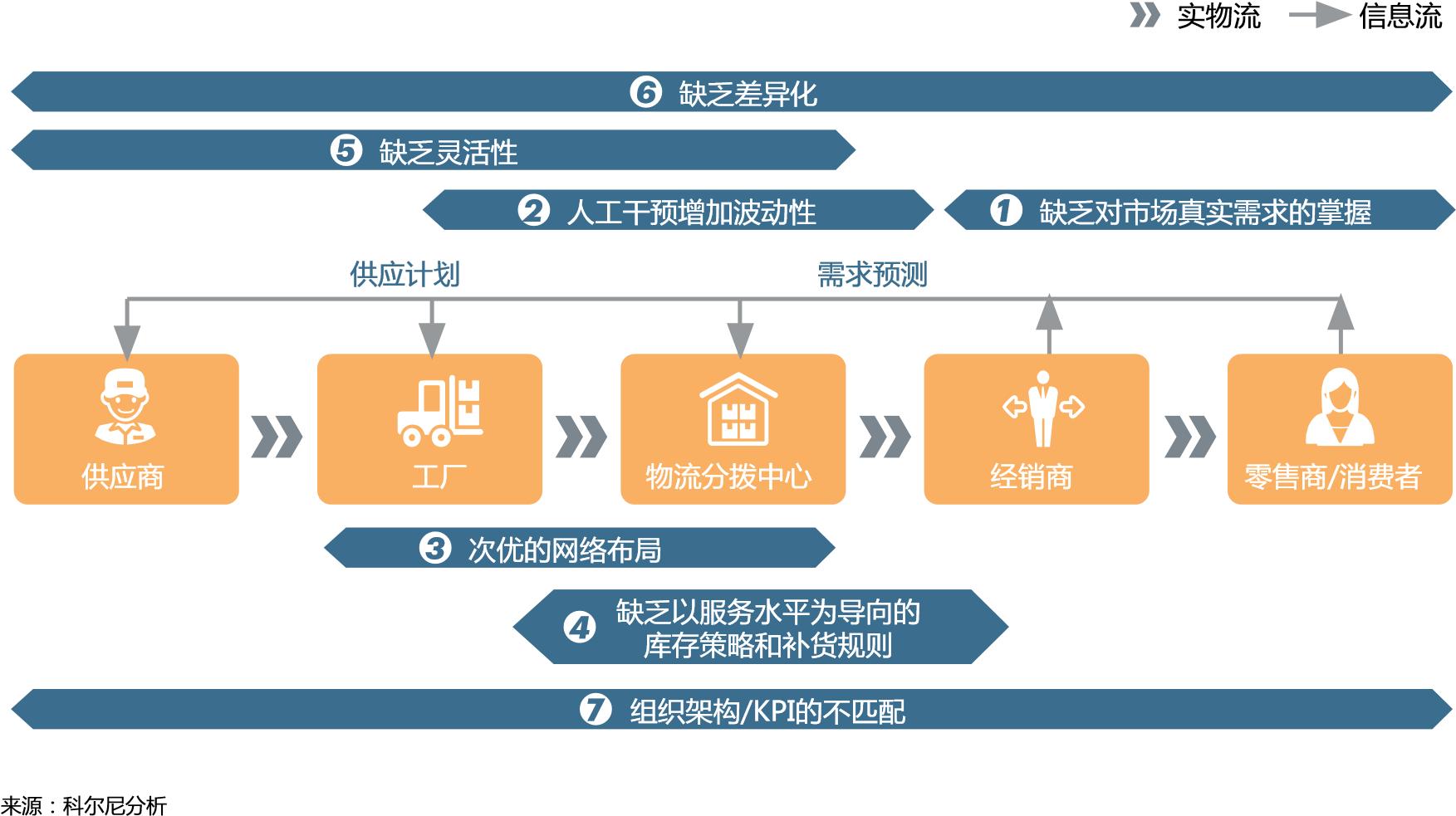 据科尔尼公司的报告《费品市场中的与时俱进》,在这种推动模式下,中国消费品的在供应链设计与执行方面存在以下七个问题: