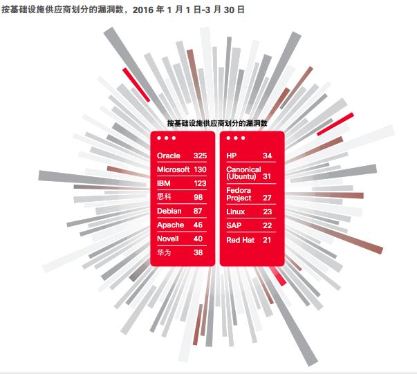 按基础设施供应商划分,Oracle漏洞数最多,达到325个;微软漏洞数达到第2,有130个;华为有38个,惠普34个,Linux 23个;最少的是Red Hat,21个。