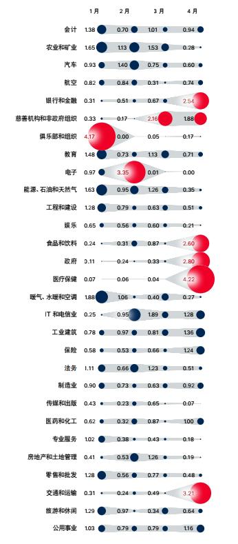 下图是29种主要行业及其相关阻止活动,以占常规网络流量的比率表示。比率1.0意味着阻止活动的数量与观察到的数据流量相称。任何高于1.0则表示阻止率高于预期,任何低于1.0的比率表示阻止率低于预期。