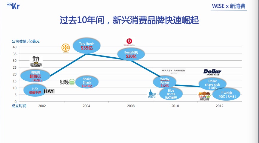 从上图中我们可以看出,这些新兴消费品牌都在短短的四至十四年的时间中,成长为了估值至少十亿美金(刨去数据不详的)以上的独角兽公司。尤其是 Beats 在八年时间内成长到以 30 亿美金被苹果收购,还有 DSC 仅用了 4 年时间就达到 10 亿美金被并购的体量。