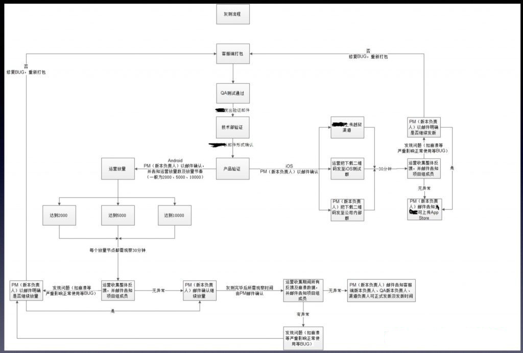 LineLian还经历过有数千万MAU而没有任何发布监控工具的发布过程,过程是这样的:三个月前大BOSS说我们要首页革旧除新,当前的DAU小超过千万、经过革新一定能超过1500万,产品经理信誓旦旦、通宵达旦的赶出来原型、经过设计、技术苦逼哈哈的研发,很牛逼的到了内侧,大BOSS说这个布局不错,允许上线,但是没有上线监控工具,这个时候就用以下图中流程来逐步放量。 图如下: