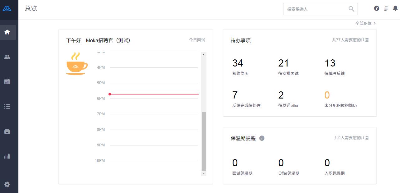 Moka通过取得HR的邮箱授权,接入了拉勾、智联招聘、Boss直聘等主流招聘网站的数据,HR在这些招聘平台发布职位后,便可在Moka上完成对简历的集中管理,不用反复在各个招聘渠道来回切换。除此之外,系统还支持HR与用人部门协同完成之后的面试、offer发放等工作 。同时,Moka还提供了“保温期”功能,可提醒HR与即将参加面试或者收获Offer的候选人保持联系。作为一款CRM,Moka能够让企业成员实时了解招聘工作的进度,同时也会依据一定标准为HR将每天的工作事项进行排序,提高其工作效率。