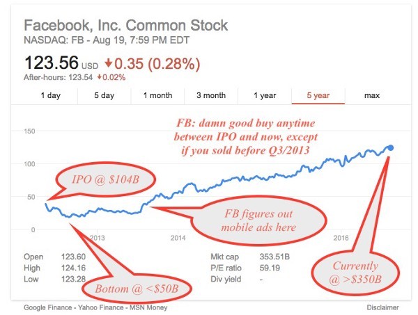 事实证明,大多数独角兽和许多科技公司 IPO 估值过高,但其中一些实际上还被低估了。还记得Facebook以超过1000亿美元上市的情形吗?可之后在不到3个月的时间内就像石头一样直接跌倒了500亿美元以下。然后在接下来的4年之内又像火箭一样从后IPO的谷底几乎攀升了7倍。谁能料到这样的事情发生呢?