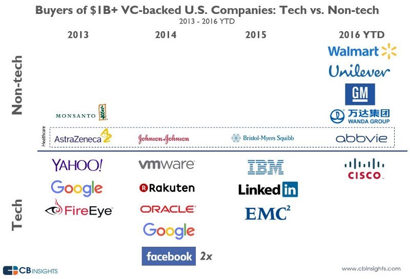 图:10亿美元以上获VC资助公司的买家:科技类公司与非科技类公司