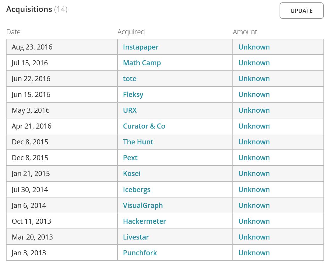 Pinterest迄今为止的所有收购交易,其中2016年就有6笔。