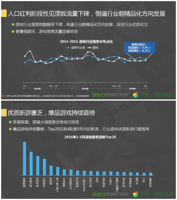游戏行业关注度下降,老游戏常年霸榜,新游戏出路在何方?近日360发布了《2016年Q2游戏行业研究报告》,其中从几个角度给了新游戏一条出路:端游、角色扮演、休闲益智、科幻题材、魔幻题材……