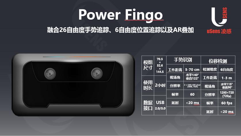 另一款产品为Power Fingo,自身集成了电池以及高通骁龙处理器,为开发者提供了inside-out位置追踪、ARVR场景切换以及26自由度手势追踪。