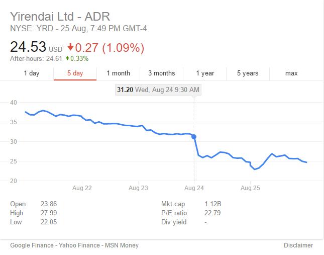 受这一消息影响,宜人贷股价下跌超过22%。8月24日收跌6.92美元至24.52美元,次日股价一度反弹超过10%,至27.89美元,但涨幅随后回落,最终收于24.53美元,涨幅仅0.04%。