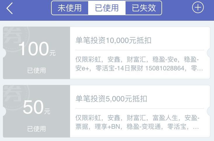 以某金融平台为例,一次性发放5张,代金券面额加起来750元。我使用了2张,一张是5000抵50,一张是1万抵100,后面还有3张200元的,使用的门槛依次是5万、10万、20万。这背后的逻辑是:使用完5次肯定就是一个高度忠诚用户了,同时,为了避免都是薅羊毛的用户,必须提升用户的支付金额,去筛选真正优质的投资用户,同时最关键的是,一个用户补贴750元这个价格在一定时间内是可收回的。CAC<=LTV/3,用户获取成本小于用户终生价值的1/3。