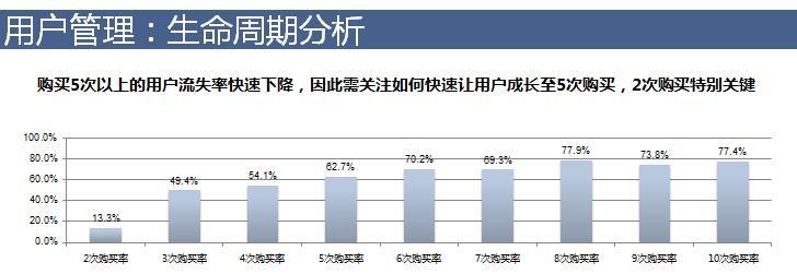 1、在用户导入期,1-5次购买是一个用户流失与否的关键期,如何通过代金券引导和刺激用户完成5次消费,将会对用户留存产生至关重要的作用;
