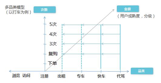 滴滴最开始做出租车业务的时候就是一个二维模型,只需要关注如何通过代金券刺激用户完成更多交易,支付更多金额。随着专车和快车的发展,逐渐减少出租车代金券的发放,开始大量发放专车券,把用户全部从出租车导向专车,专车的用户规模快速扩大;后面的快车、代驾也都如此,用户增长模式如下图所示:
