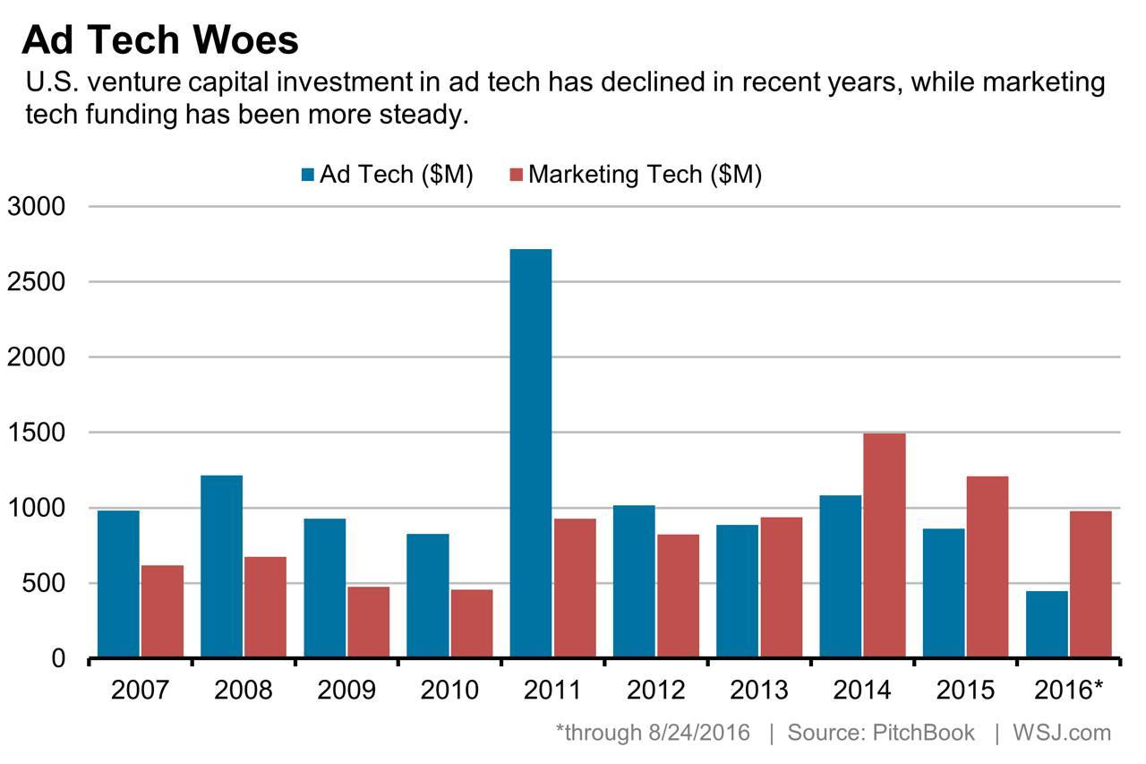 据风险投资和私募股权数据公司PitchBook的统计显示,风险资本对广告科技公司的投入自2011年达到27亿美元的峰值后持续回落,去年该项投资是8.6亿美元,为自2010年以来的最低值。而截至目前,已被录得的投资是4.46亿美元,就节奏上而言属于2005年以来的最低资金水平。