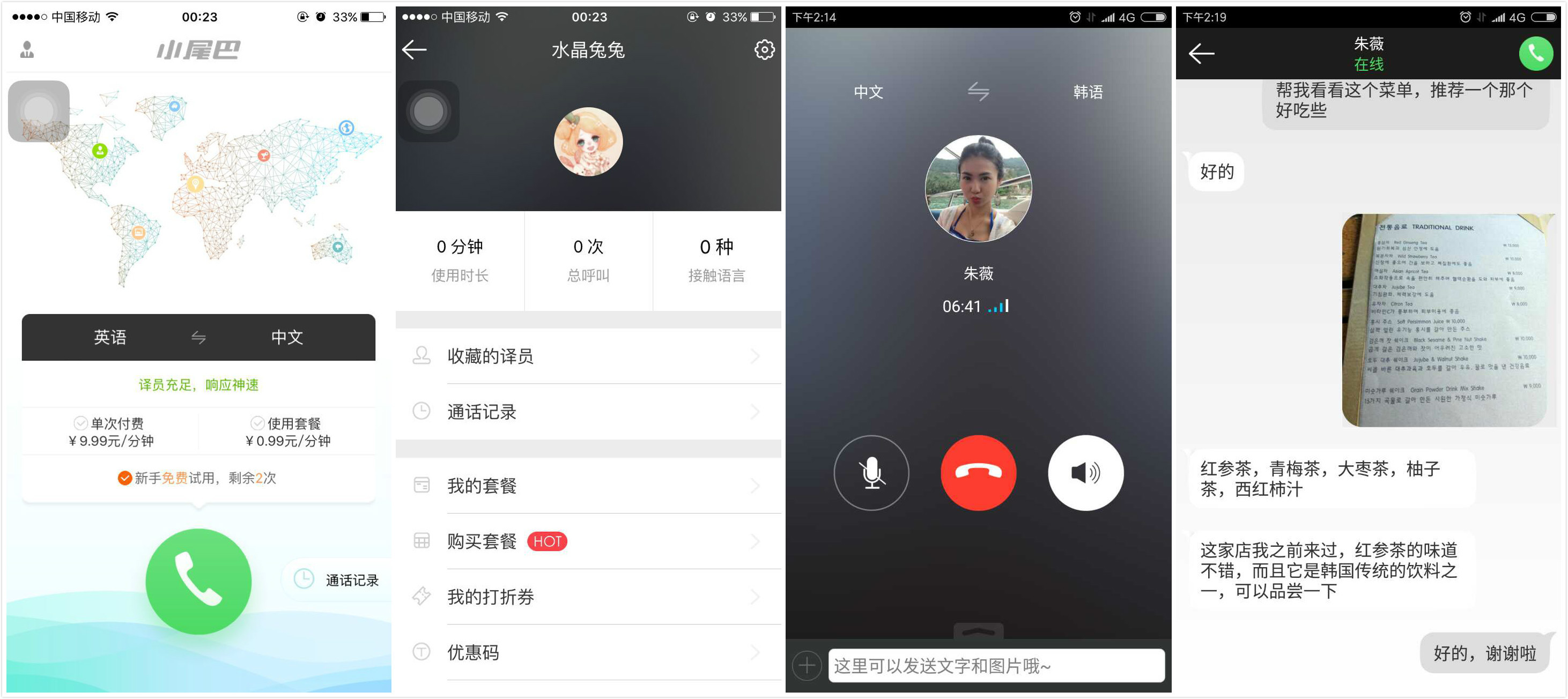 基于此,“小尾巴” 从出境旅游市场切入做了一款连接用户与人工译员的App。用户可以在App上选择英语、日语、韩语、西语 、泰语等十一种语言间的互译,用户与译员间是以网络电话的形式连接,后台系统会基于用户的地理位置和语种情况精准匹配译员,而译员的评估包含所属行业、兴趣点、从业经历、相关资质及用户评价等几个维度。比如中国用户在一家韩国餐厅吃饭语言不通需要点餐的时候,“小尾巴”能为其匹配有在韩国生活经历的译员,甚至能匹配到去过该餐厅的人,这种精准匹配译员背后的逻辑类似于滴滴打车。在接通译员后,用户能与译员边语音通话边用文字或图片辅助沟通,而其收费的方式既可以按照分钟也能包天或包月。