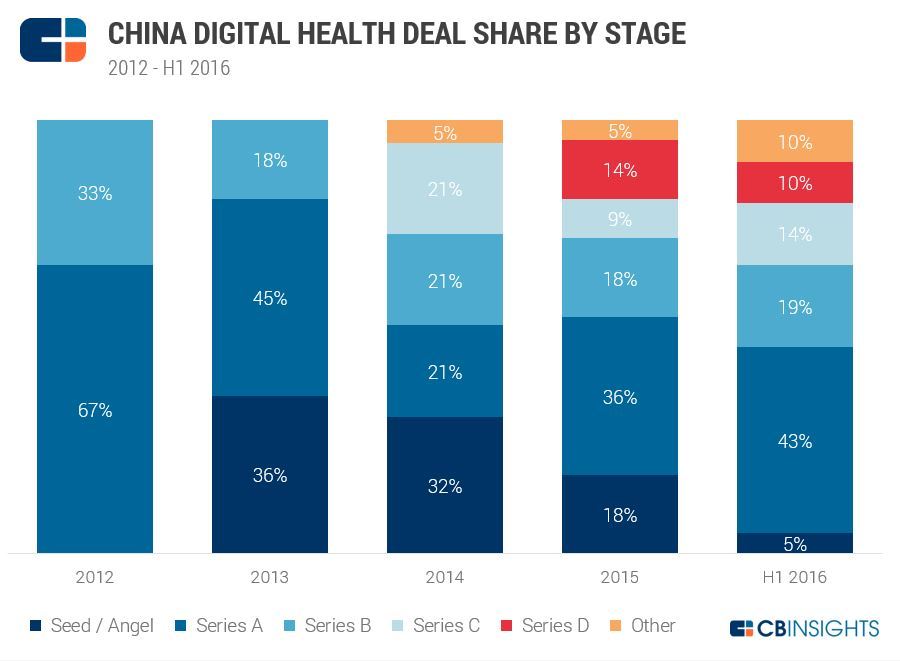 CBInsights认为,随着中国数字医疗市场吸引而来的投资越来越多,交易活动也在朝着成熟的方向发展,从下图可以看出,处于后阶段融资的交易从有到无,占比逐渐增大。