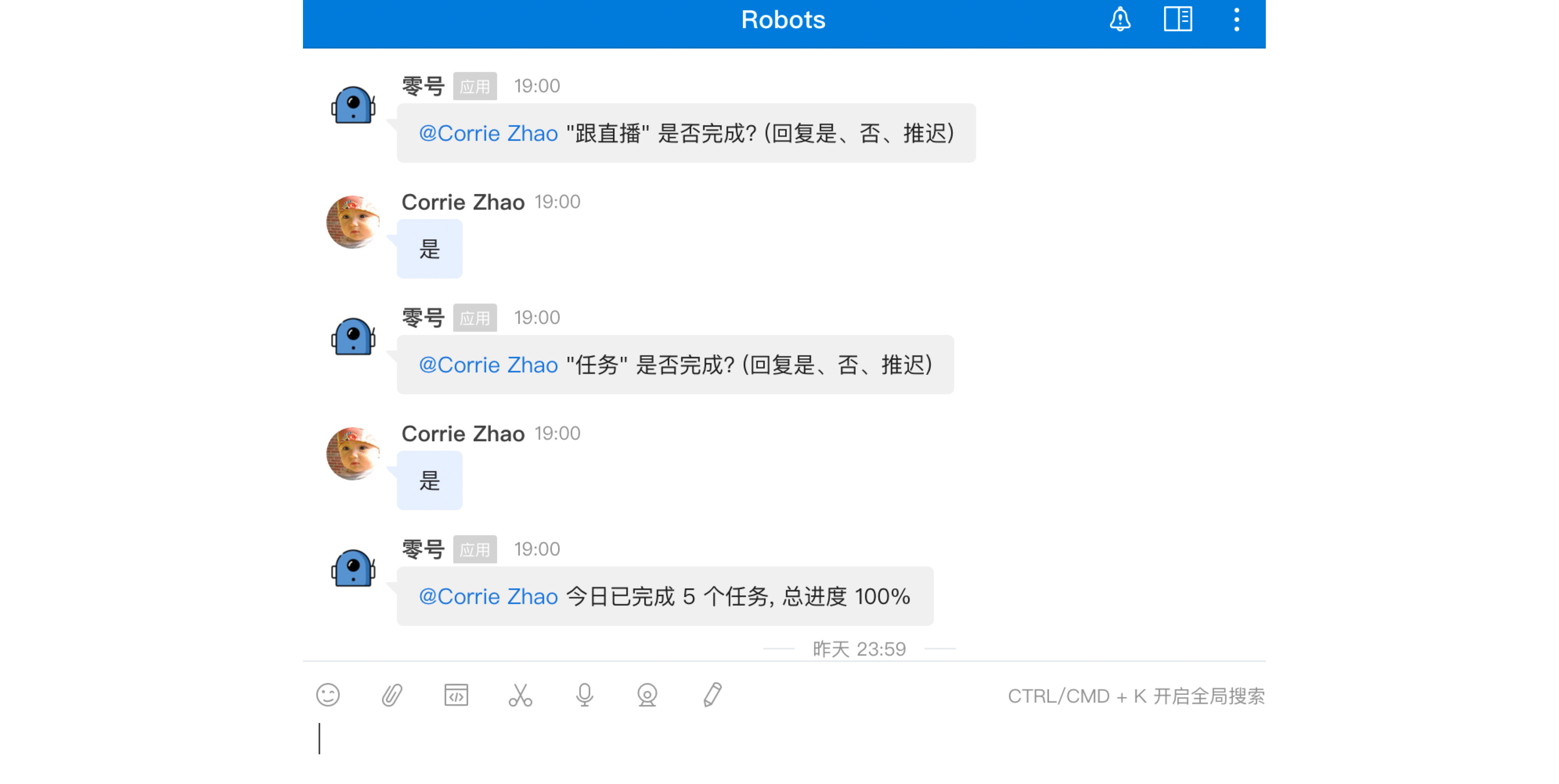 目前,零信也支持用户通过接入其API自行相应的开发工作,例如,简书团队便整合自己的业务系统,实现了在零信上进行新书上线、评论审核等工作。未来零信团队也会推出一项机器人服务,借助此项服务,用户可以开发属于企业的自定义机器人,帮助企业处理相应的业务。