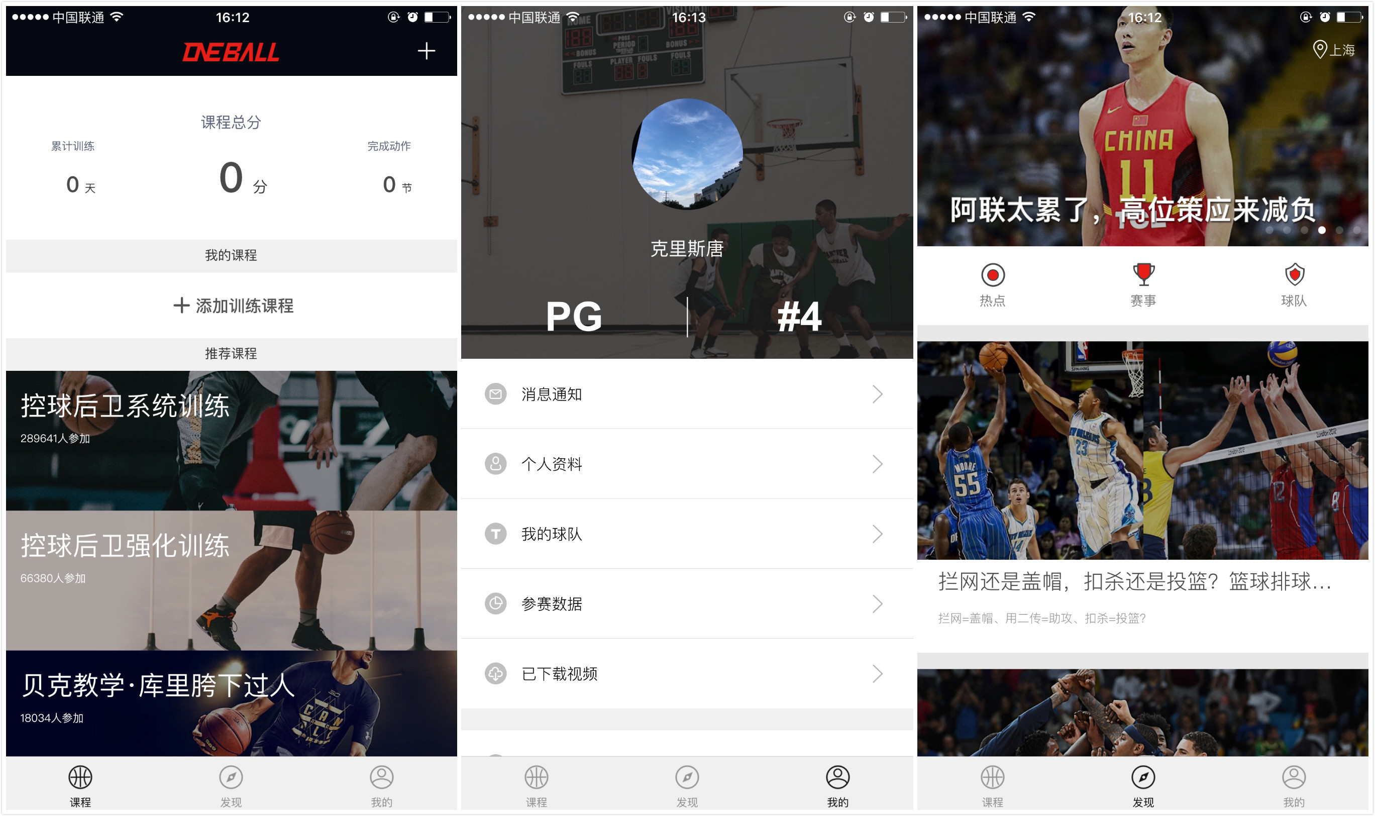 壹球App在模块上,设置了“课程”、“发现”和“我的”三个模块。