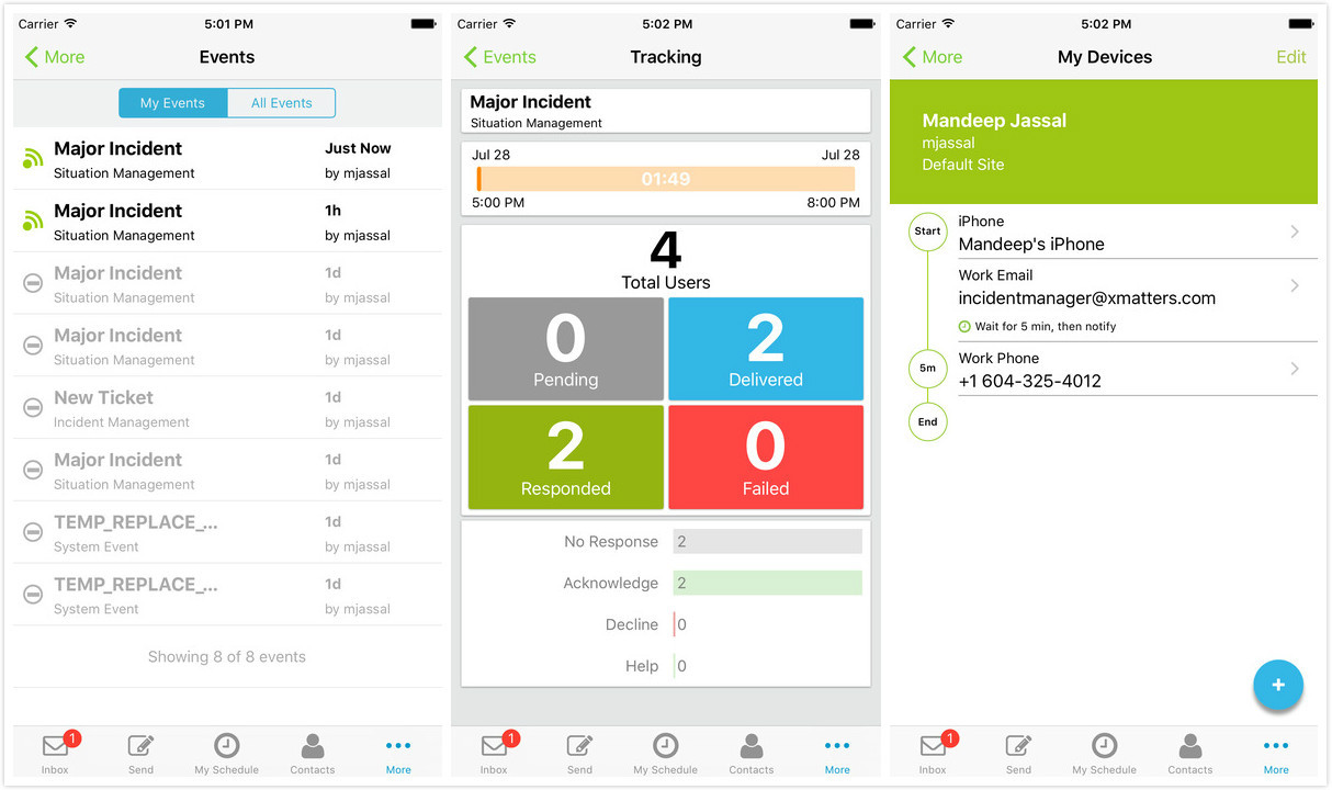 稳定性上,xMatters技术旨在提高业务部门协同工作的效率,即使在自然灾害、医疗状况和IT故障等突然性的事件时,仍然能够保证业务的继续运行。xMatters可以通过IT系统的自动监测,或者用户手动发送场景,“在对的时间找到对的人。”