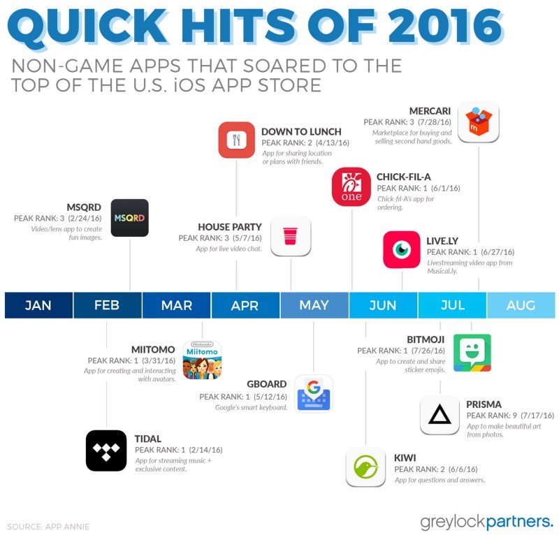 这一切让大家可以在手机上做一些新事情。它们都得到了病毒式传播并且发展迅速。这些发展会不会变成未来的平台还不好说,但不可否认的是,大家对下载app然后试用很感兴趣。保持app粘性是另一个问题,但先让大家愿意尝试是必要的第一步。下面就是2016年某些“迅速走红”的app例子: