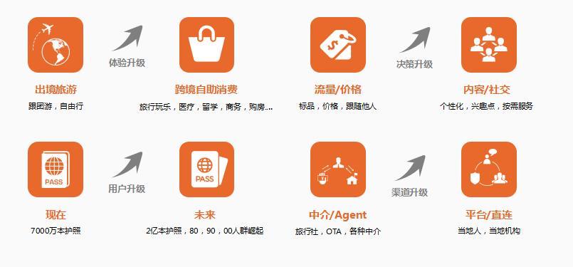 如果让我来总结,就是8个字”传统谢幕,迎接新王“。6年时间不要觉得很短,06年到12年的去哪儿很大程度上就扮演了新王登基的角色。所有行业都在谈消费升级的时候,我们必须要仔细想一想旅行的消费升级是什么?人群都是谁?拿目前形势大好的出境游来参考,升级的维度是主力用户人群发生变化,体验模式发生变化,连接渠道发生变化,购买决策发生变化。我们用下图来做个参考: