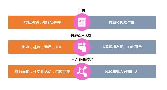 工具、兴趣点+人群(社群)、新平台模式都会有创造新品类的可能,他们维度完全不是商品属性的维度,换句话说不是OTA们开一个频道就可以干的,OTA要干从产品到营销也得重新另起炉灶。而目的地IP,如果只是商品交易,OTA开个新频道就很容易做,比如邮轮,海岛这种品类对OTA来说是非常容易的。如果要从这些机会找出更大规模的机会,比如能不能成就一个100亿美金的公司,我觉得还是要从跨境,目的地服务这样的领域去寻找一个可以成为平台级公司的机会。