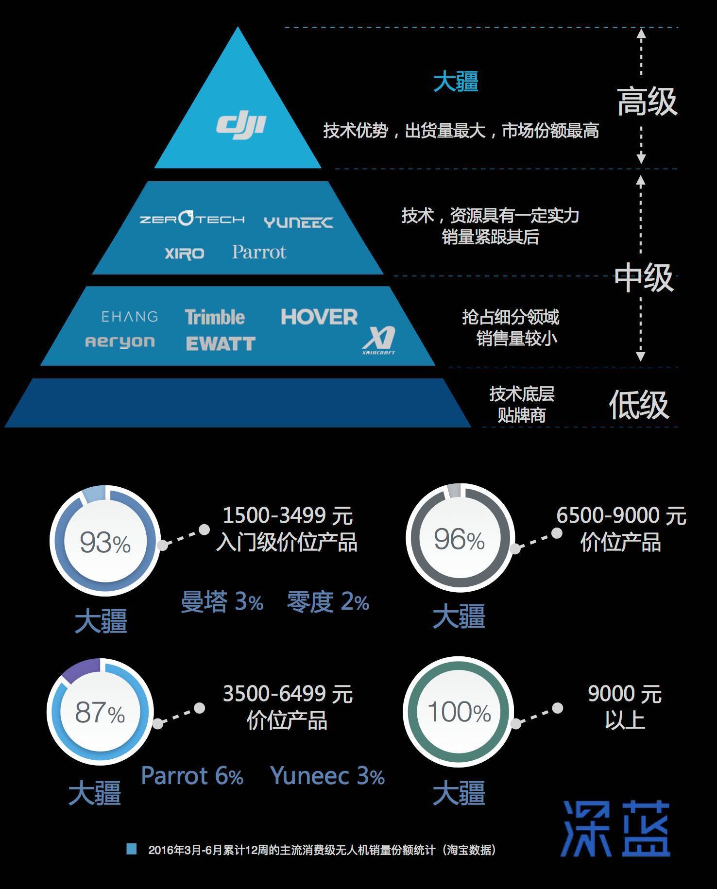 消费级无人机市场是大疆一家独大的局面。消费级市场长期被大疆以约 70% 的份额霸占。截至 2015 年第四季度,在美国联邦航天管理局(FAA)已通过的商业无人机准飞许可的申请中,排名前 20 的热门机型中有 12 个来自大疆。